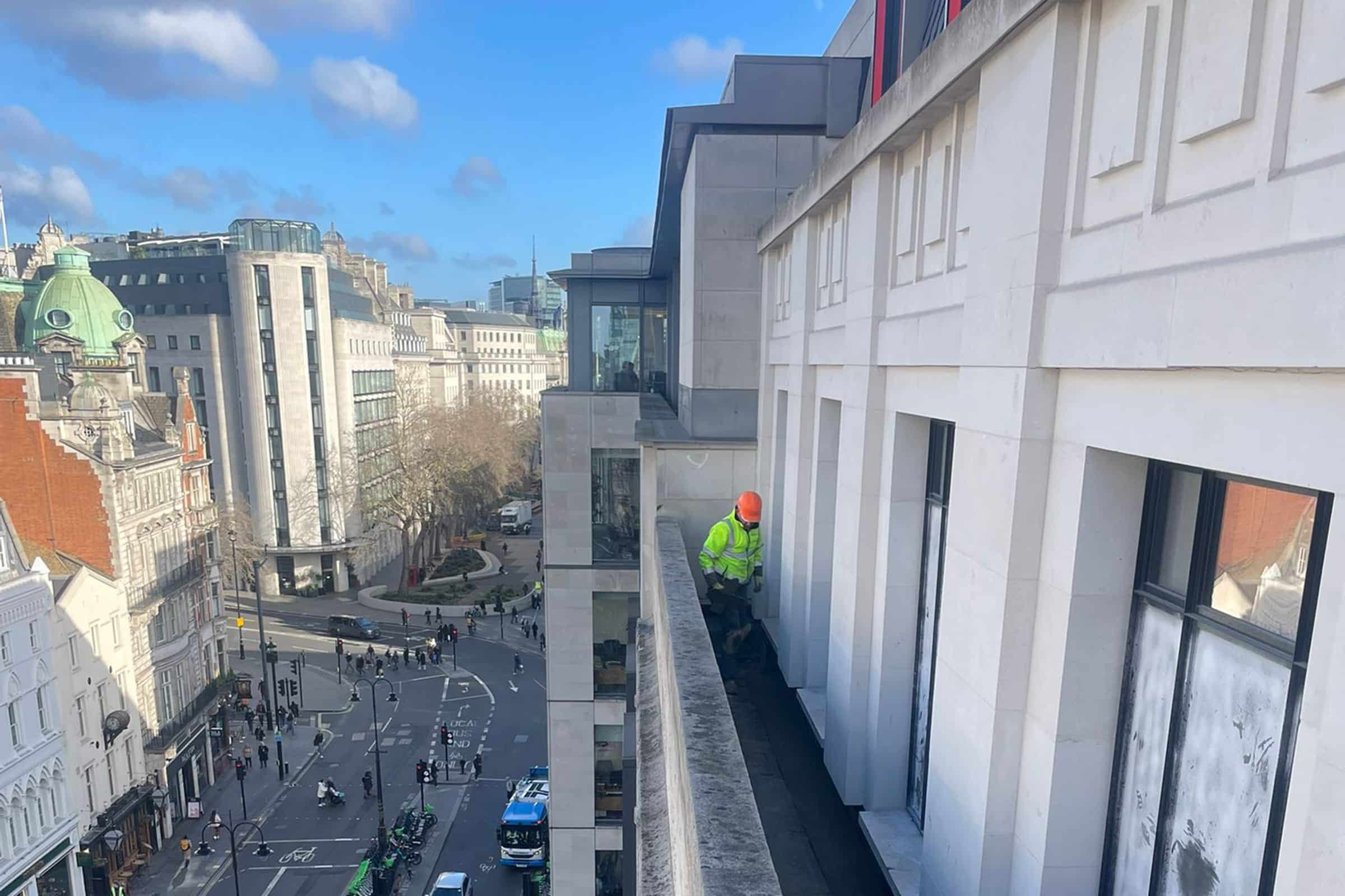 The team had to navigate the demanding conditions of one of London’s busiest streets. Securing parking and setting up equipment at street level required meticulous planning, as every move had to be coordinated without disrupting the flow of traffic or pedestrians. Adding to the complexity was the challenge of working at significant heights in a densely populated area, which necessitated strict adherence to safety protocols.